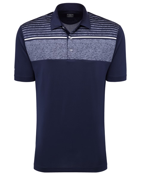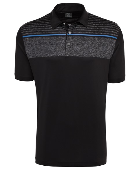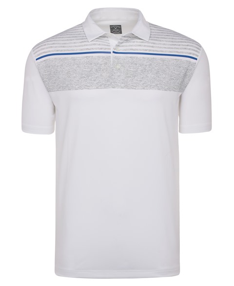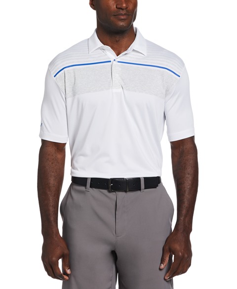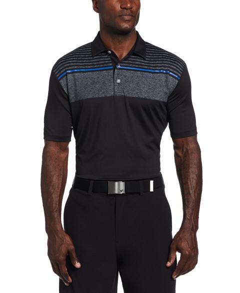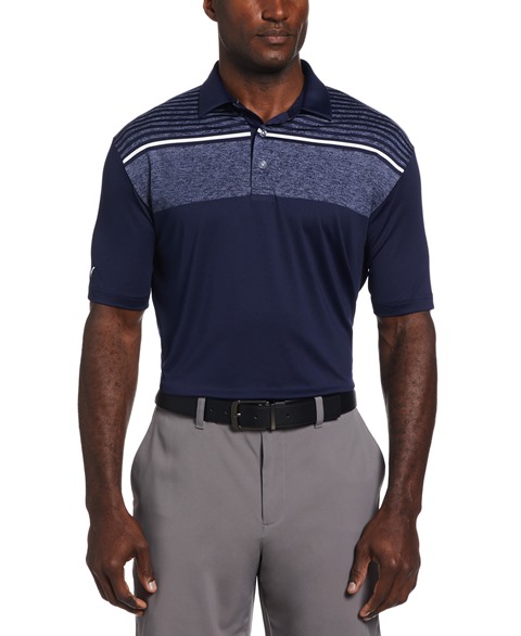 Play through with comfort and style in this pigment print short sleeve golf polo from the Standard Collection, which fuses Callaway`s most classic look into a roomier fit. Pigment printing through the chest creates a mottled appearance, while stripes forming downward from the shoulders create an added element of style. Callaway`s Opti-Dri moisture wicking technology pulls sweat away from your body to keep you cool in the heat, cooling technology transfers heat away from your body to keep the garment cool, stretch fabric is created by interwoven layers that ensure maximum range of motion and UPF 15 provides superior protection by blocking the sun`s harmful UV rays.